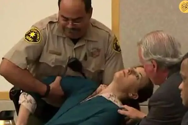 زنی در دادگاه کالیفرنیا پس از شنیدن حکم سنگین زندان در توطئه ناموفق قتل شوهرش که هدف گلوله قرار گرفت، اما جان سالم به در برد، غش کرد.