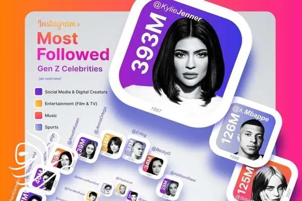 - کایلی جنر با ۳۹۳ میلیون دنبالکننده در صدر فهرست قرار دارد و پرطرفدارترین سلبریتی نسل Z در اینستاگرام است.