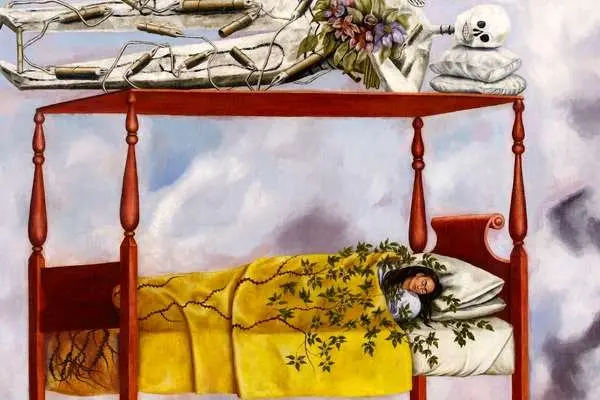 این نقاشی که عنوان اسپانیایی آن El Sueño (La Cama) است، در سال ۱۹۴۰ خلق شد. در این تابلو، کالو بر روی تختی چهارستونه دراز کشیده و در میان پیچکهای سبز آرام گرفته است. بالای تخت، اسکلتی بزرگ که با مواد منفجره پیچیده شده و دستهگلی در دست دارد، بر سایبان تخت او قرار گرفته است.