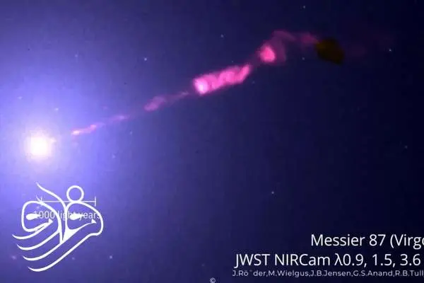 گروهی به سرپرستی «یان رودر» (Jan Röder)، ستارهشناس مؤسسه اخترفیزیک اندلس، با استفاده از تلسکوپ فضایی جیمز وب (JWST) موفق شدهاند این تصویر از فوران ذرات را که از سیاهچاله مرکزی M87 به بیرون پرتاب میشود، با دقتی بینظیر ثبت کنند.
