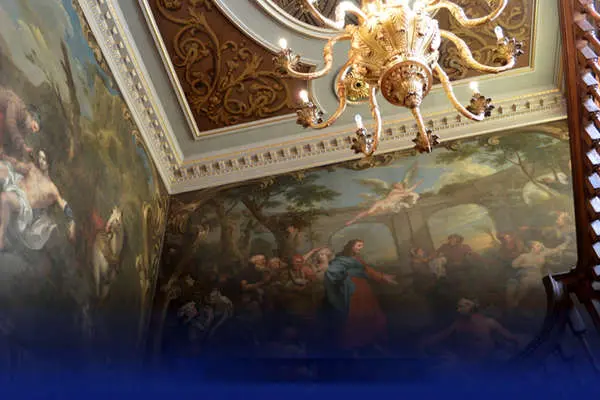 سقف طلایی و پرنقشونگار تالار بزرگ، که توسط استاد گچکار «ژان بتیست سن میشل» (Jean Baptiste St Michell) طراحی شده و تنها اثر او در انگلستان است، نیز بازسازی شد.