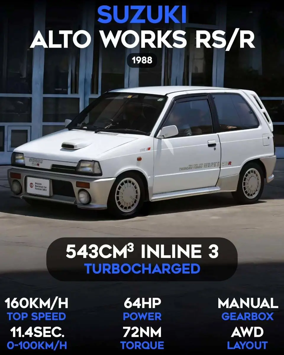 در میان این مدلها، نمونههایی از "کیکارها" (Kei Cars) ژاپنی با ابعاد بسیار کوچک به چشم میخورند که قدرتهای اندکی دارند، مانند سوبارو سمبر 4WD مدل ۱۹۸۸ با موتور ۵۴۴ سیسی باکسر و ۲۸ اسب بخار قدرت، یا سوزوکی آلتو ورکس RS/R مدل ۱۹۸۸ که با موتور توربوشارژ ۶۴ اسب بخاری به سرعت ۱۶۰ کیلومتر بر ساعت میرسد.